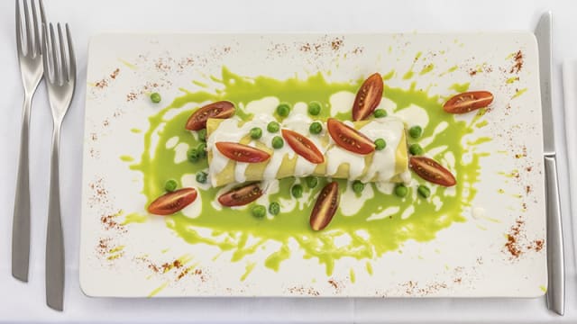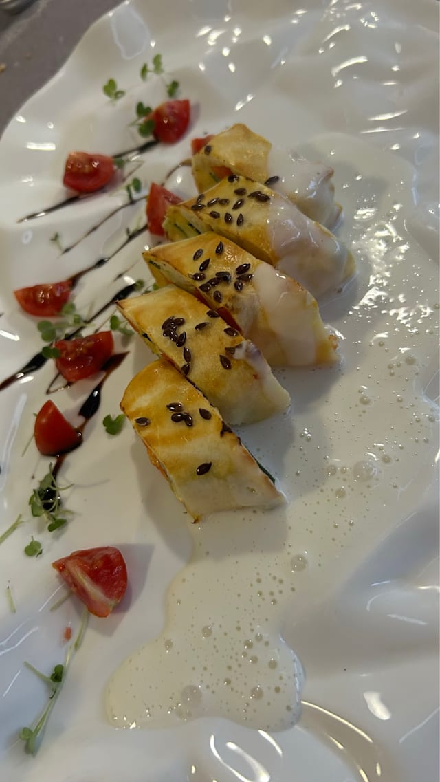7/10A lot of raw food on the menu. Vegetable strudel and fish were great. Chopped raw shrimp was not expected.