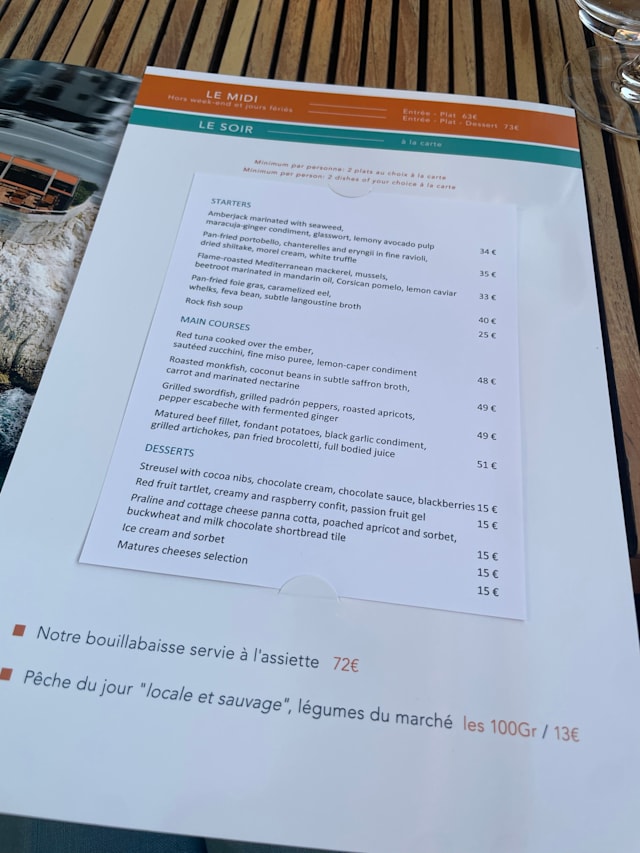 Explore the chef's selection menus with diverse dishes at fixed prices. Some are bookable via TheFork, while others are available onsite.
