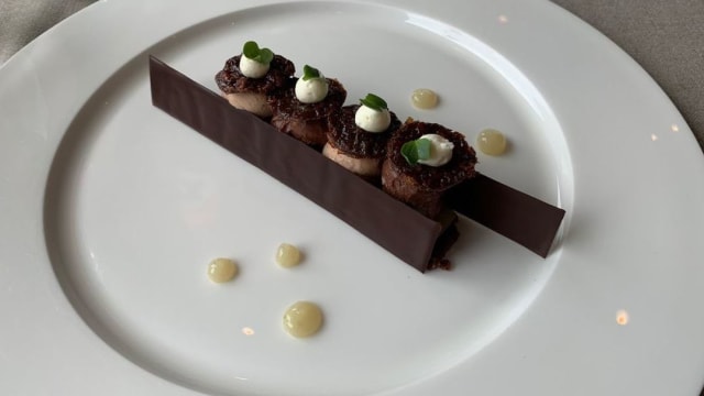 - Filet de bœuf charolais cuit au sautoir, oignons de simiane à la flamme, agnoletti morille et guanciale "porc"