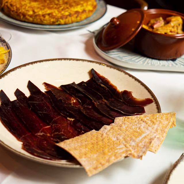 - Jamón ibérico, gambas al ajillo y rabo de toro