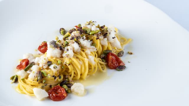 - Calamarata con battuto di pesce bianco, pomodorino datterino e maggiorana