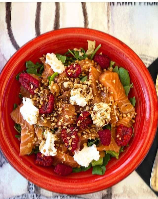 Sashimi di salmone rucola, lattughino, lamponi freschi, fommaggio caprino e nocciole tostate. Condimento: aceto batsamico, olio, sale & pepe