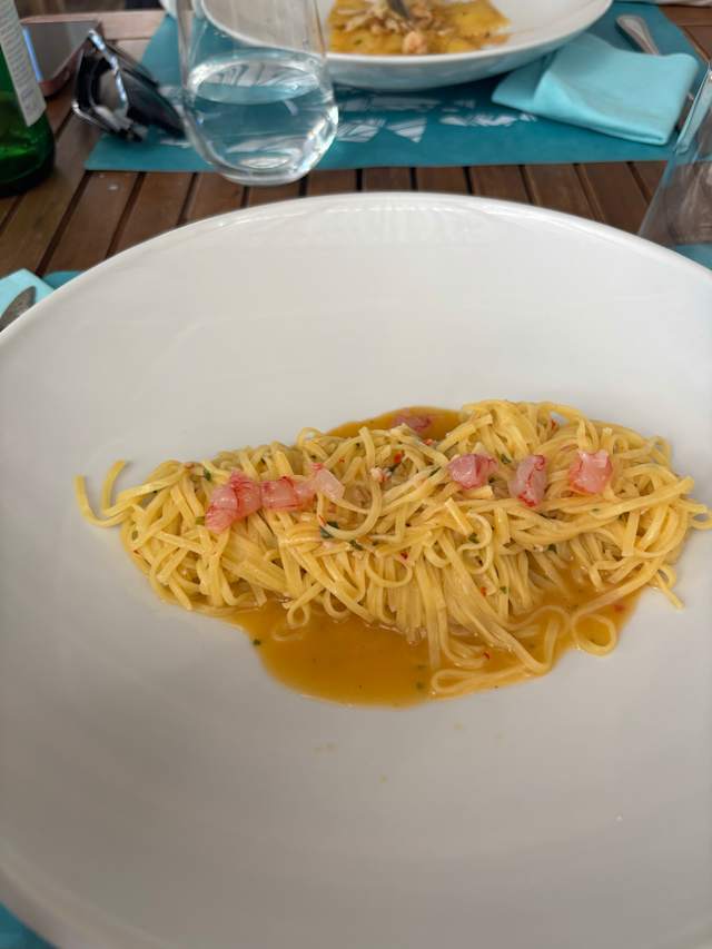 - Tagliolino trafilato al bronzo e tartare di gambero roso di mazzara