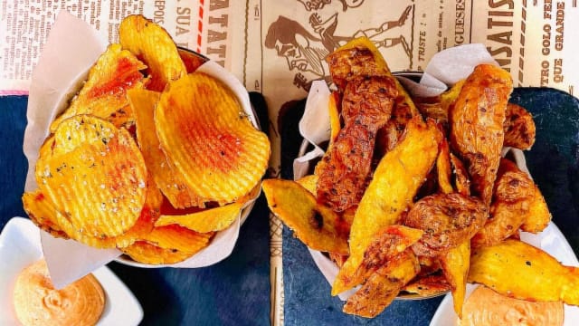 - Bolo do caco, compota de cebola, queijo, tomate e alface, acompanha com batata frita