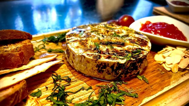 - Gratinado em azeite, alho, mel e oregãos, acompanha com tostas caseiras, frutos secos e fruta da época