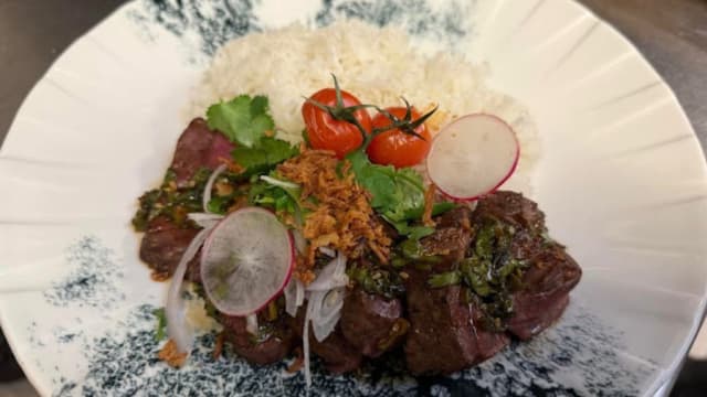 Émincé, façon Tigre qui pleure & herbes fraîches, riz cambodgien