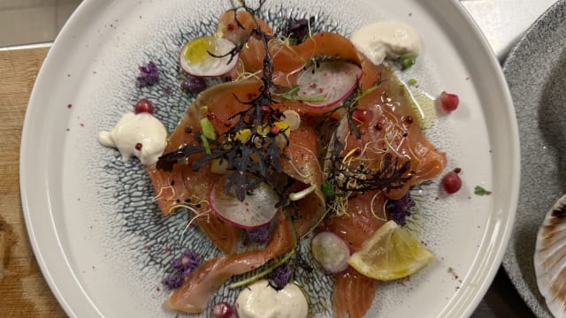 En carpaccio, gingembre, Granny-smith Smith, radis rose, coriandre.