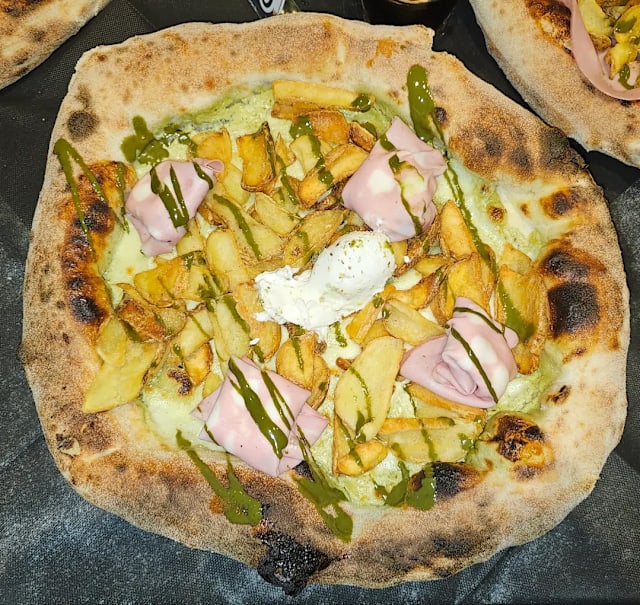 Pan pizza, polpetta di cavallo, provola fresca affumicata campana, cipolla rossa, insalata iceberg, pomodoro semi-dried rosso, olio evo, origano
