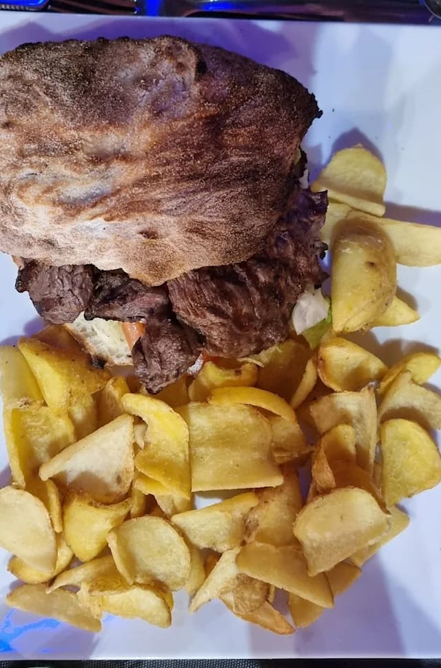 Pan pizza, picanha, maionese, insalata iceberg, pomodoro cuore di bue, cipolla rossa. Servito con patatine fritte dippers con buccia