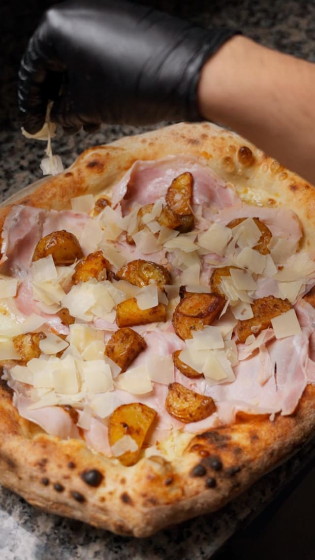 Fiordilatte campana, bacon , patate al forno, crema cacio e pepe, straccetti di coscia di pollo, crema di pistacchio, olio evo, prezzemolo