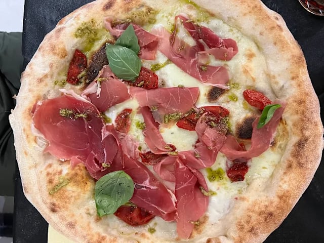 Pan pizza, polpetta di cavallo, provola fresca affumicata campana, cipolla rossa, insalata iceberg, pomodoro semi-dried rosso, olio evo, origano