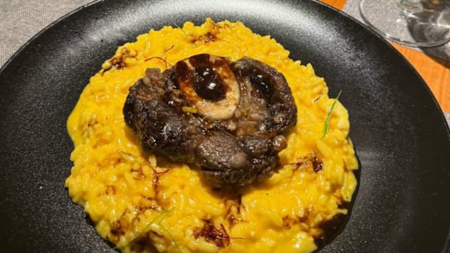 Tartare di manzo servita sull’osso e il suo midollo, condita con sale maldon, olio evo, pepe nero, con crema allo zafferano