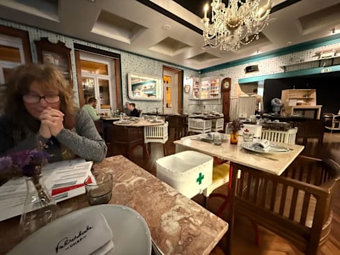4/10We werequite surprised when we asked for the menu that the waiter gave each of us a A big plastic paper instead with lots of information about this pharmacy restaurant, TWO pages long in fine print. We said we were tired and hungry and had no interest in their elaborate information. Instead we asked again for the menu. The waiter seemed not amused and turned around rather upset or so it seemed. After that incident the evening never became nice. We ate a little bit and left unsatisfied. We do not wonder what their point is, we are guests and visit a restaurant for food. What we ate, you are obliged to share each dish (?) was ok.