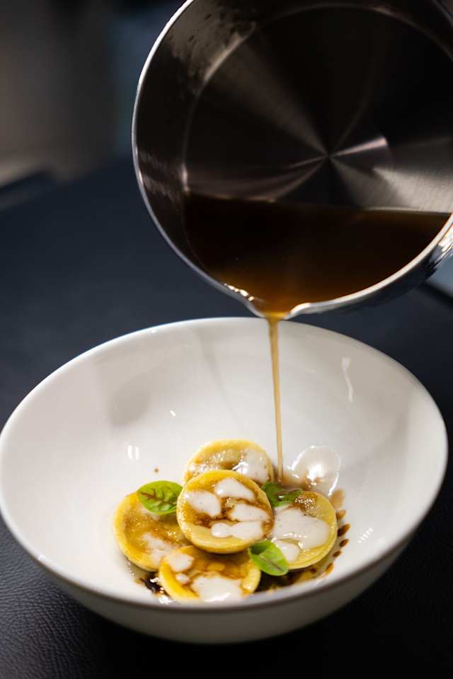 - Bottoncini di pasta fresca al tuorlo d'uovo fatti a mano e ripieni di arrosto di vitello cotto al forno e verdure di stagione, saltati al burro bianco e finiti con riduzione di vitello.