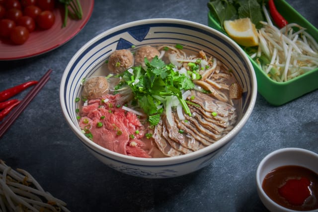 Bouillon à base de boeuf, nouille de riz, boeuf cru et boulettes de boeuf , coriande, menthe vietnamien, ciboulette, oignon et poussé de soja