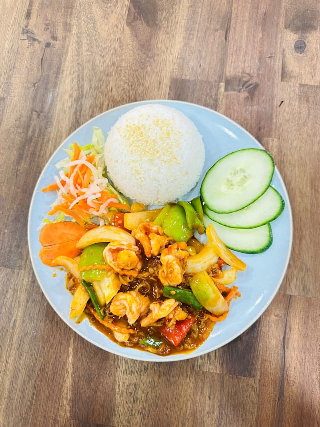 Fideo de arroz, carne de cerdo a la parrilla, limoncillo, zanahoria, lechuga, hierba, pepino, cacahuete, cebolla frita servido con salsa agridulce vietnamita.