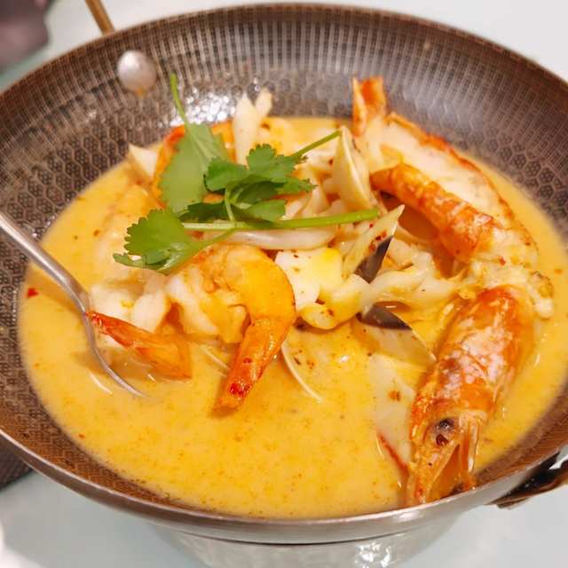 - Spaghetti di riso oppure ramen noodles alla cambogiana con ragù di suino, torta di pesce, calamari* e gamberi*
