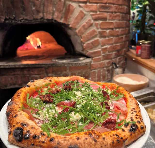 - San marzano tomatsås, fior di latte, prosciutto crudo, ruccola, parmigiano, soltorkade tomater