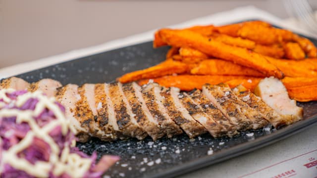 450 gr fusi di pollo fritto e panati con panko, paprika dolce e spezie varie, accompagnati da peperoni sabbiati, patate dippers & salsa sweet e chilly