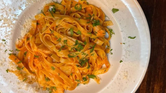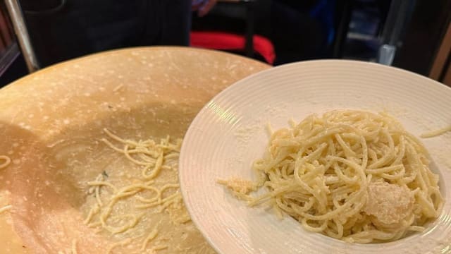 Tomatensaus, parmezaanse kaas, geflambeerd met vecchia romagna