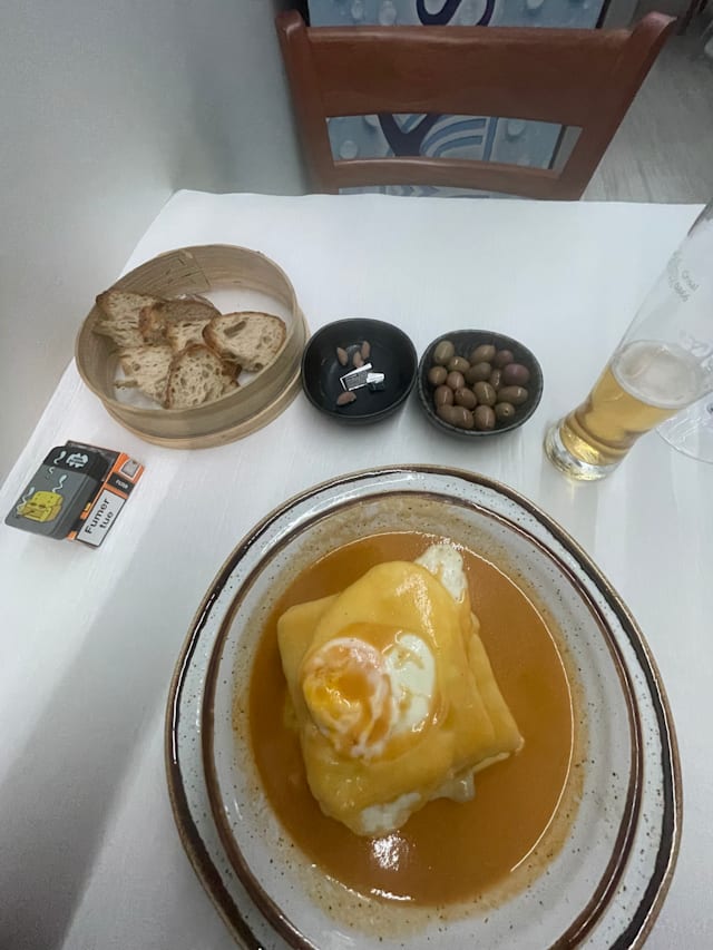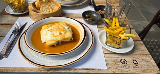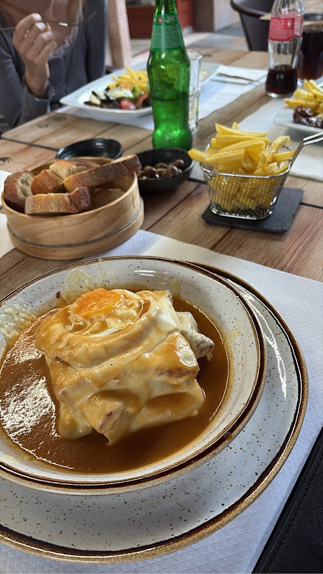 Sandwich servi sur assiette avec tranche de bœuf, jambon, mortadelle, chorizo, linguiça et saucisse, nappé de sauce maison pimentée et recouvert de fromage fondu