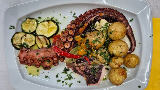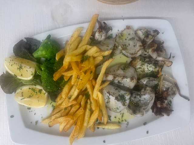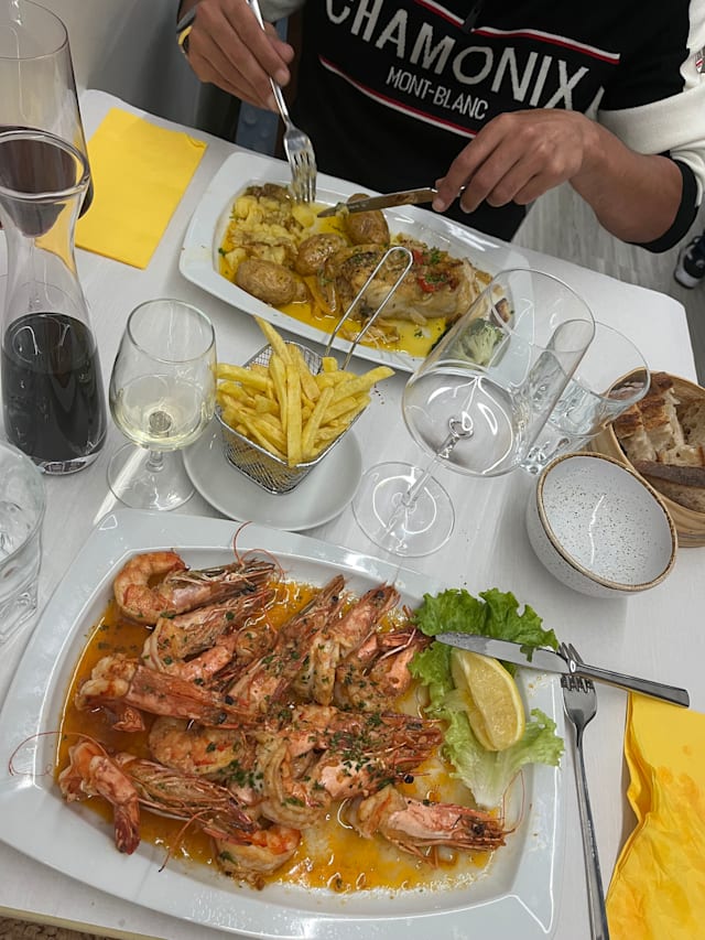 Plateau pour deux personnes contenant : pica pau, moelas, 2 rissóis de carne, 2 rissóis de camarão, 2 bolinhos de bacalhau, poulpe, ovos rotos, le tout accompagné de frites maison