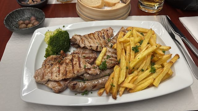 Tranche de bœuf, poitrine, escalope et saucisse de porc grillées, accompagnées de frites maison