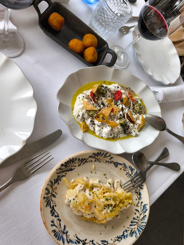 Stracciatella, aguacate tostado y tomates semisecos