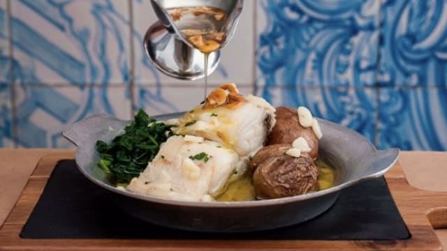 - (lombo de bacalhau cozido no azeite servido com batata a murro e espinafre)