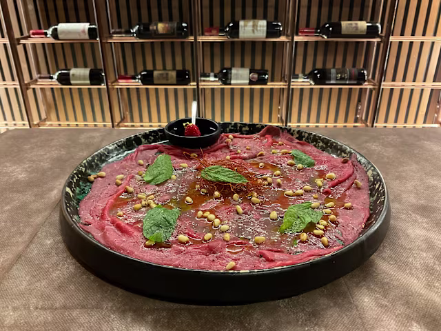 - Demi carpaccio con rucola, grana e salsa di rucola e nocciole
