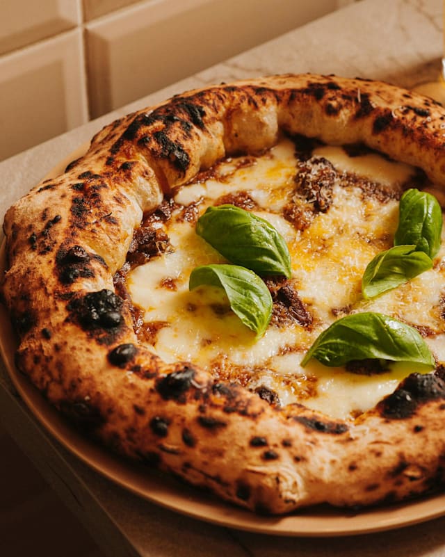 Ragù napoletano cotto a bassa temperatura, grana padano 24 mesi, mozzarella di bufala campana D.O.P, basilico fresco, olio EVO bio.