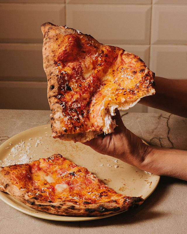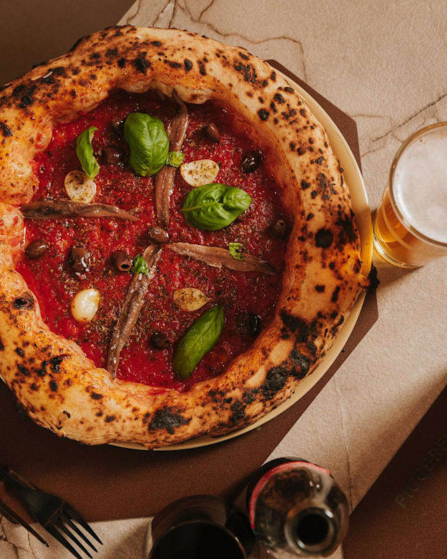 Ricotta di bufala campana, ciccioli di maiale, provola di agerola, pomodoro san marzano DOP, basilico fresco, pepe, olio EVO bio
