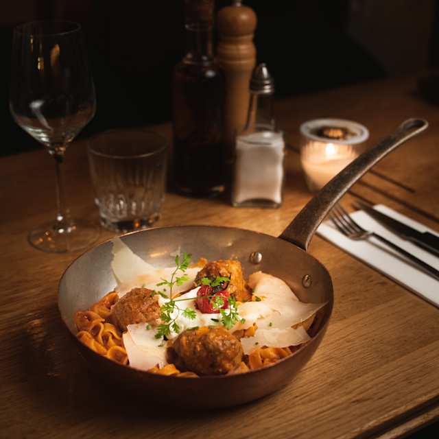 - Boulettes de viande à la sauce napolitaine, stracciatella, tagliatelles