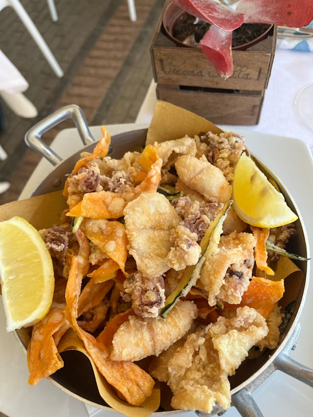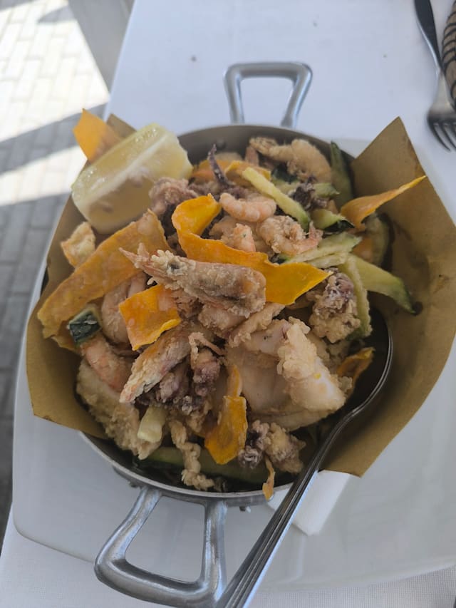 5.5/10Poor service with an unfriendly waitress. In addition someone collapsed during our visit with an ambulance arrival which did not add to a pleasant ambience . The food - the mussels was okay and large fritto misto was quite nice The white wine is nice though not so memorable. What was great is the view of the sea which was most pleasant .