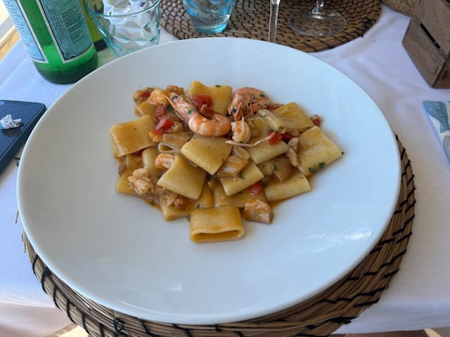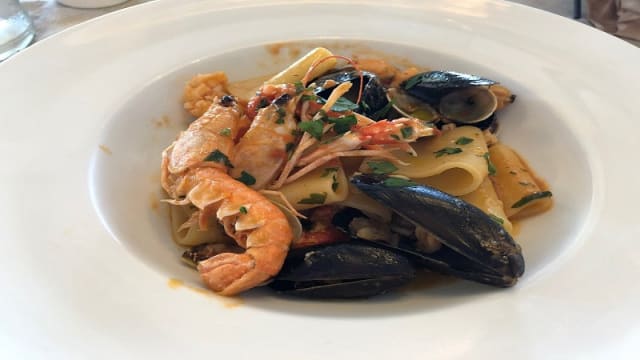 5.5/10The place is next to the sea and the view is amazing. But the quality of the food is really dissapointing. I took the griliatta mista del mare, and the shrimp was old, spada or whatever it was dry. Tuna was sour, polpo overdone. The other dishes were so so. One point about the service, it was good, but it was too much. The waiter was overreacting, every choice was good and wonderful. Even the bottle of water was a good choice ;).
