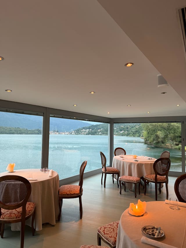 10/10Fantastic view. Sitting literally over the lake with the mountain view. Food innovative with a cacophony of flavors and textures and sights. Flexible enough to allow different degustation menus to be ordered by each diner. Great wine list with emphasis on Piedmontese wines. Unforgettable experience! Well worth the small detour