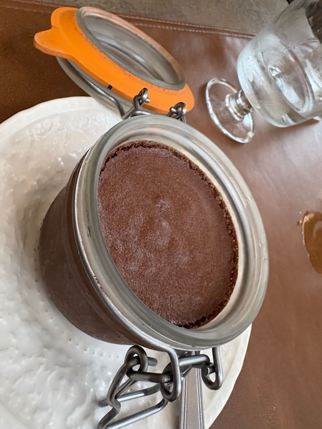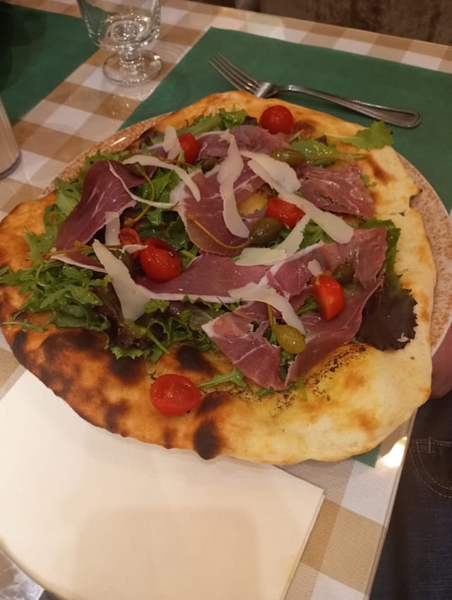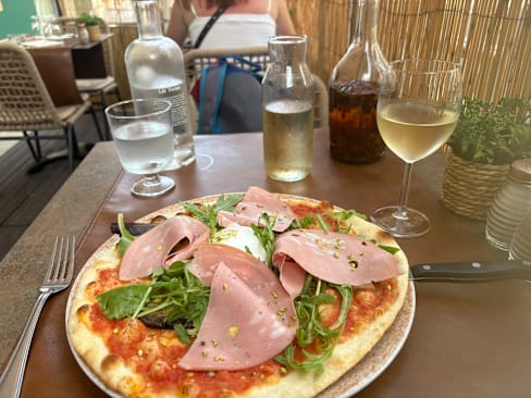 10/10Mortadella and buffalo pizza. White Gard wine. Chocolate orange mousse.