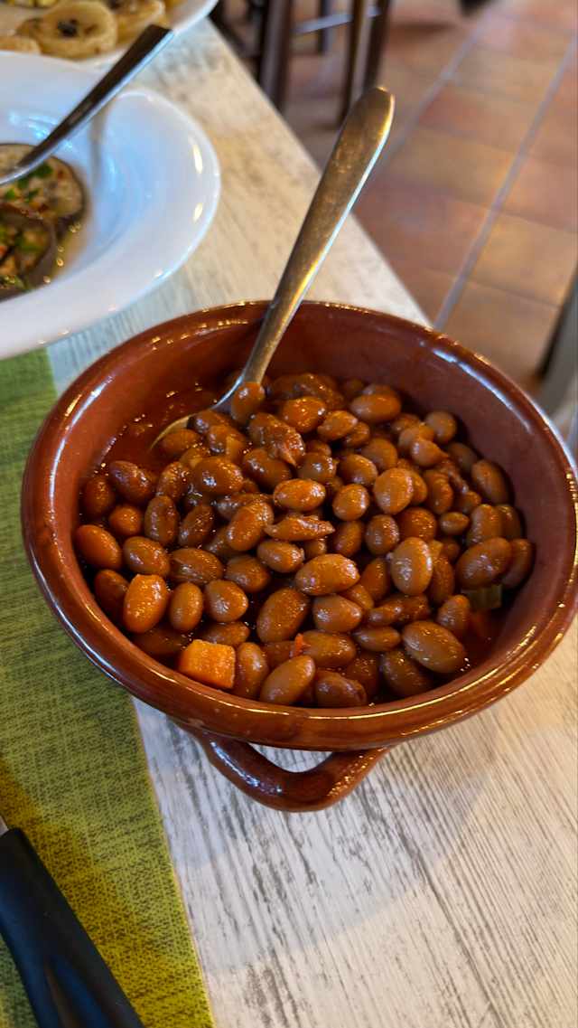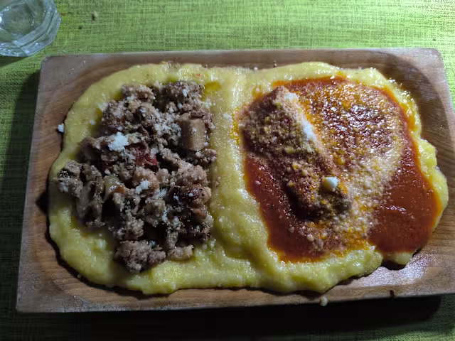 - Polenta artigianale con sugo di spuntature e salsicce o con funghi porcini salsiccia e pachino servita su scifetta di legno
