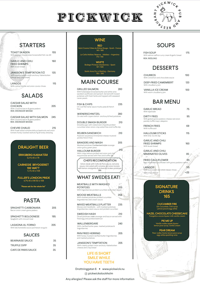 10/10A welcoming place on a cold, wet, miserable evening. Pickwicks is a traditional pub with a small restaurant. Don’t be fooled by the “pub”image, the food is really good. We’d booked and were seated immediately. Service was quick and the guy that served our table was friendly & helpful. The drinks came quickly and were soon followed by 3 servings of delicious meatballs with creamy mash, creamy sauce and pickled cucumber & lingonberries to cut through the richness. The other order was for schnitzel & that was voted a hit too. The two desserts were also excellent & prices were as we expected. Will definitely return if the opportunity arises and definitely recommend.