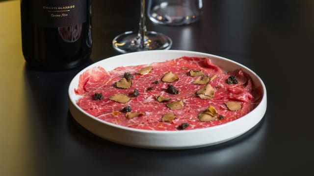 Carpaccio di black angus affumicato con parmigiano vacche rosse rucola e pomodori confit