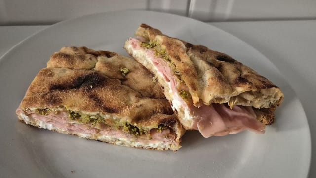Pesto pistacchio, burrata, pistacchio e mortadella.