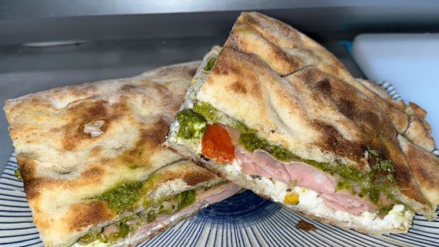 Pesto rosso, mozzarella, pomodorini confit e prosciutto cotto.
