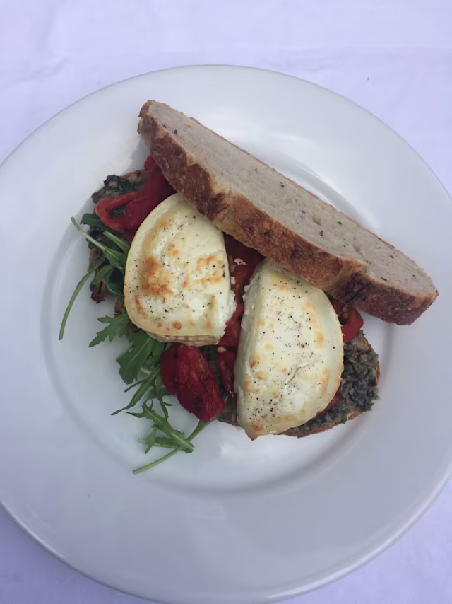 - Meerzaden brood, geitenkaas uit de oven, gegrilde groenten, cherry tomaten, walnoten en balsamico glaze