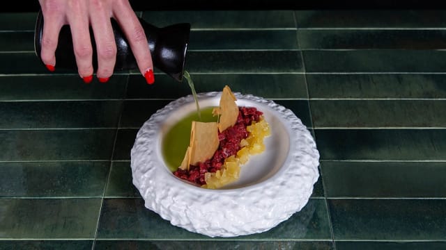 Tartare di manzetta prussiana, chutney di mela e zenzero ed estratto di cetriolo