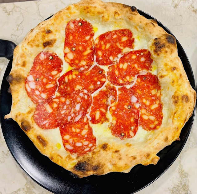 - Pomodoro pelato (oro del vesuvio), fiordilatte campano, salame piccante, olio evo, basilico