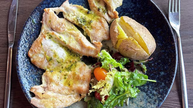 - Tradicional plato de dorada al horno con un a salsa de AOVE, ajo, guindilla, vino blanco y vinagre.