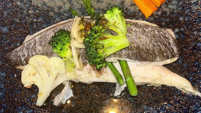 - Lomo de bacalao confitado con muselina de ajo tostada y verduras asadas.