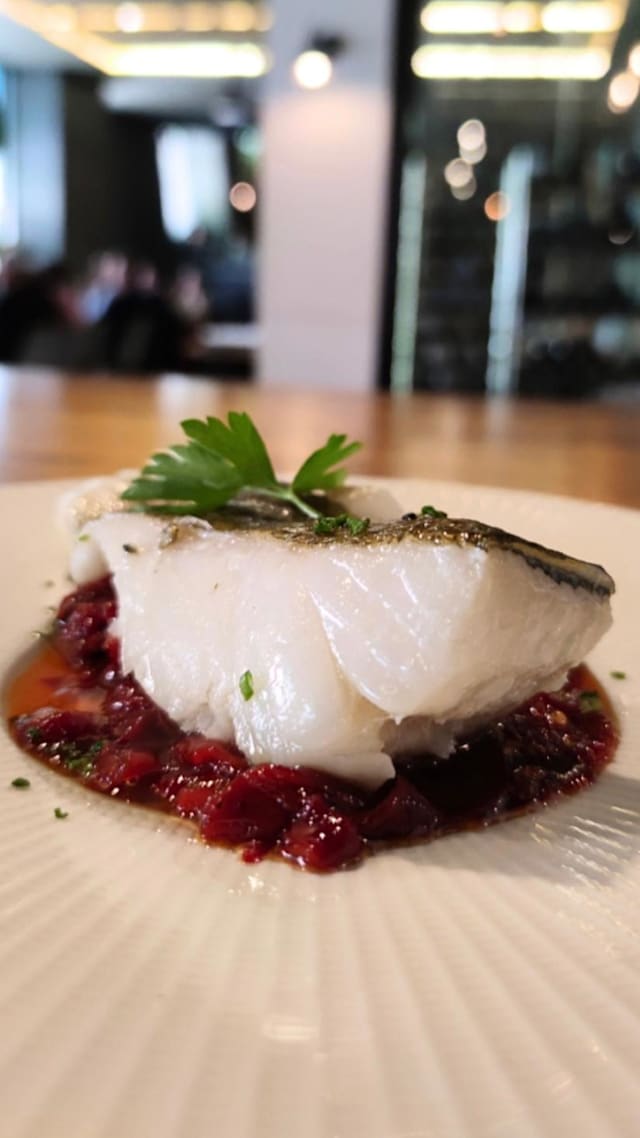 Atún rojo a la brasa con vinagreta de tomates secos, trigueros, almendras y mahonesa de chipotle