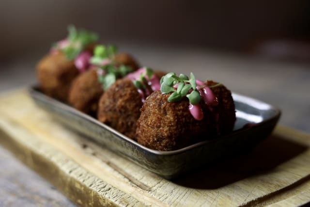 Iberische ribbetjes zonder bot | zoetzure saus | gefrituurde uitjes