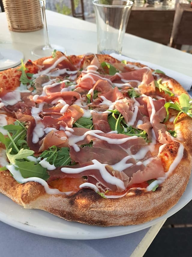 Salsa di pomodoro, mozzarella di bufala, rucola, prosciutto crudo di parma, fonduta di grana padano.